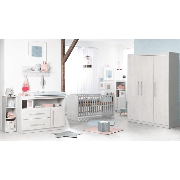 De brede luierwisselunit zonder zichtbare schroeven, met luierwisselbevestiging en hoogwaardige roestvrijstalen leuninghandgrepen, met een comfortabele luierwisselhoogte van 90 cm, maakt de verzorging van de baby tot een plezier voor ouders en baby. Dankzij het open vak, de twee laden aden en de opbergruimte achter de deur is alles snel bij de hand als er behoefte is aan babyverzorging. Zonder de luiertafel dient de luiertafel als commode. Het wisselstuk voldoet aan de huidige veiligheidsnormen volgens EN 12221 – 1+2:2008 + A1:2013.