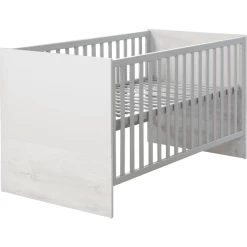 Het kindercombinatiebed ‘Nele’ van roba heeft witte fronten met horizontaal freeswerk en een spijl in het decor ‘Artisan oak’. Het ligoppervlak van het bed is 70×140 cm. Om gemakkelijk in en uit het bed te stappen, kunnen 3 glijdende sporten worden verwijderd. Het ligvlak is in hoogte verstelbaar en kan in 3 verschillende posities worden vastgezet. Het kinderbedje kan gemakkelijk worden omgebouwd tot een Junior bed met de extra ombouwzijkanten. Een bijpassende bedbodem is ook apart verkrijgbaar.